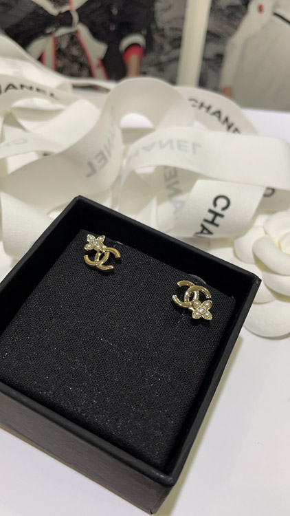 Celine pearl rhinestone small flower gold double C earrings-3898