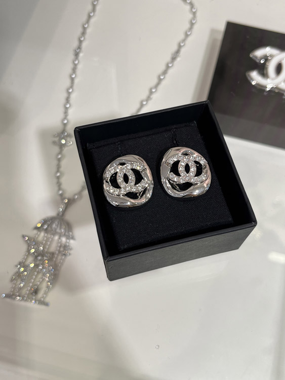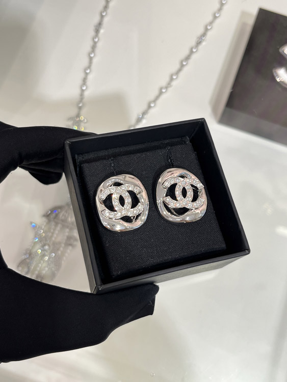 Celine silver full diamond double C hollow square earrings-3901